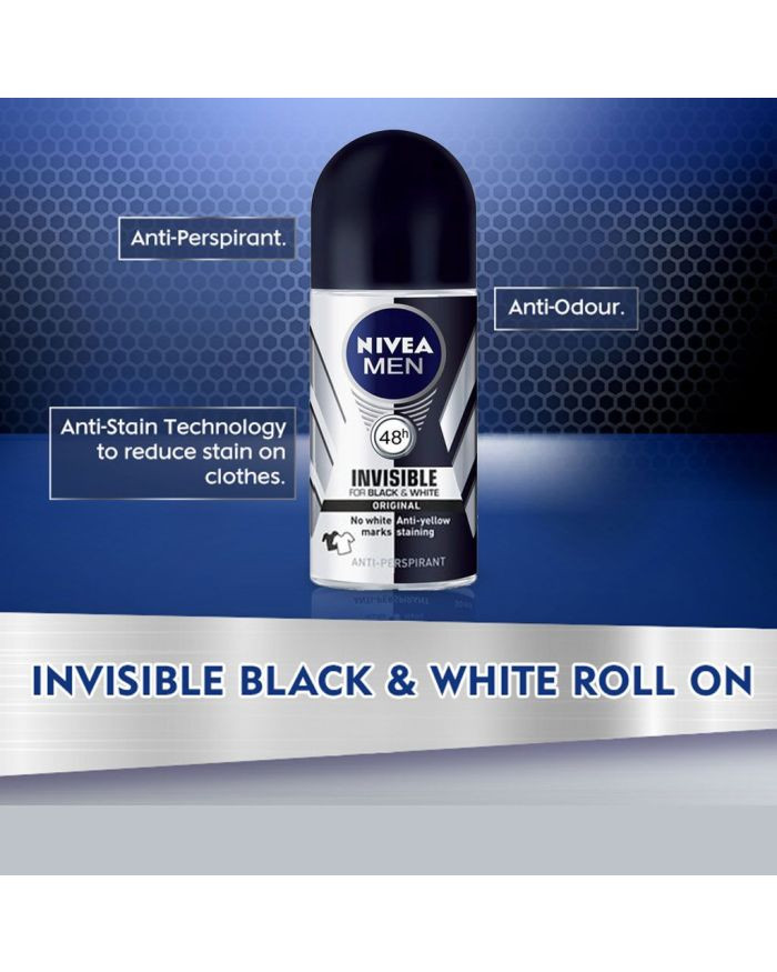 Nivea Men Invisible for Black and White Roll-on gives you day long body odour protection while keeping your shirts free of underarm stains. It has an anti-yellow stain technology that protects the shirt and your confidence while you wear it. Ensures day long protection against body odour while caring for your underarms. This roll-on is dermatologically proven to be safe on skin, as it also contains 0% alcohol. Smell great, feel fresh and stay stain free.