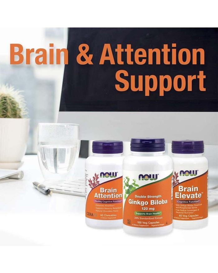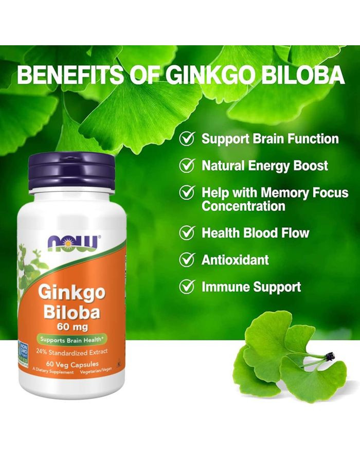 Now Ginkgo Biloba 60mg Vegetarian Capsules For Brain Health contains herbal extract that helps with the peripheral blood circulation, therefore may enhance blood circulation in the brain. It can be used to improve mental and cognitive function. Now Ginkgo Biloba Extract is standardized to min. 24% ginkgo flavonglycosides and 6% terpene lactones. The extract comes from the leaves of the famous Ginkgo tree with its dynamic history of populating the earth for millions of years. Gingko contains high levels of flavonoids and terpenoids, antioxidants that provide protection against oxidative cell damage from harmful free radicals. Ginkgo has been repeatedly evaluated for its ability to reduce anxiety, stress, and other symptoms associated with Alzheimer's disease and cognitive decline linked to aging. Ginkgo biloba may offer a range of health benefits, including improving cognitive function. Researchers believe that ginkgo improves cognitive function because it promotes good blood circulation in the brain and protects the brain and other parts from neuronal damage. The herb is believed to help increase the body's choline uptake, promoting acetylcholine levels, which could make it beneficial in the battle against brain fog.
