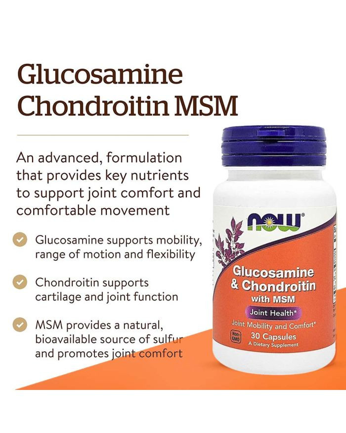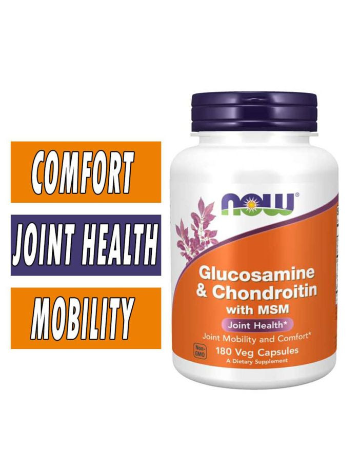 Now Glucosamine & Chondroitin With MSM Capsules For Joint Health combines three of the best known nutrients available for the support of healthy joints in one dietary supplement. This is a potent combination of three proven, purified ingredients that help build and serve as a shock absorber for your joints. Scientific studies have demonstrated that Glucosamine and Chondroitin can promote normal joint mobility and comfort. MSM is present as a naturally occurring sulfur compound for optimal nutritional support for the production of healthy joint structures. Glucosamine supports flexibility and mobility. It also supports the formation of cartilage, an important element in joint health. In joint support applications, Chondroitin Sulfate helps to support joint fluids and their ability to cushion and lubricate. A source of sulfur, MSM may promote the formation of collagen, an important component in the structure of cartilage and is vital for joints. Now Glucosamine & Chondroitin With MSM Capsules provides you with the perfect combination of potent dietary supplements that will help you maintain and support your joint health throughout your active Lifetime.