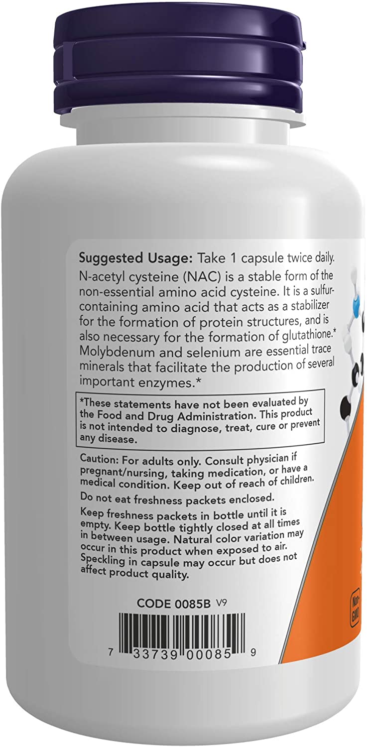 • FREE RADICAL PROTECTION*/MAINTAINS CELLULAR HEALTH*: Take 1 NOW NAC veggie capsule with selenium and molybdenum twice daily for free radical protection and to maintain cellular health*. N-acetyl cysteine (NAC) is a stable form of the non-essential amino acid cysteine, and molybdenum and selenium are essential trace minerals that facilitate the production of several important enzymes.*