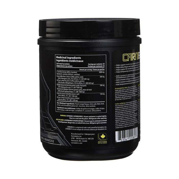 Nutrabolics Carnibolic Peach Mango 150g contains L-Carnitine Tartrate, a form of Carnitine that aids in fat burning and increases energy. It also includes additional ingredients such as electrolytes and natural flavors to support hydration and performance.