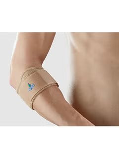 Wrap support around the elbow and position the circular pad on the extensor or flexor muscle and fasten it.