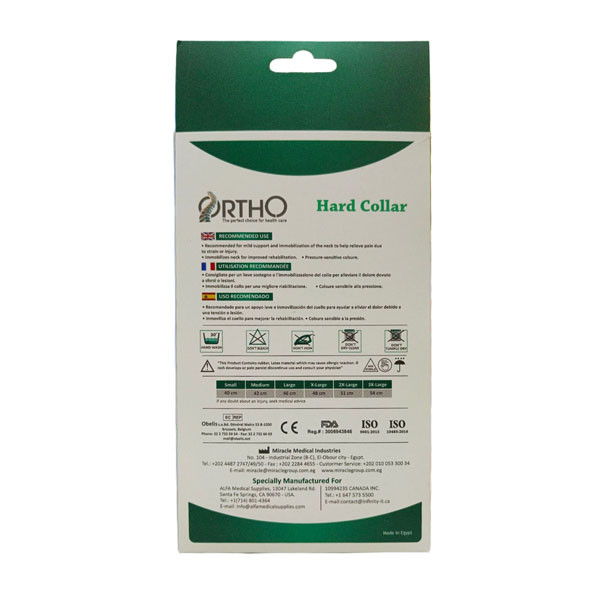 An Ortho Hard Collar, typically available in various sizes, is a medical device used to provide support and immobilization to the cervical (neck) spine. These collars are made of rigid material and are used for various medical conditions or after certain types of surgeries or injuries.