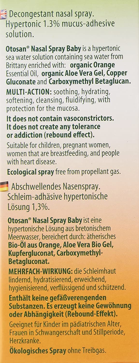 It is recommended as an adjuvant treatment to free a blocked nose in the presence of sinusitis and inflammation, such as different types of colds, rhinitis and dryness of the mucous membranes. Otosan® Nasal Spray Baby hydrates and protects the irritated mucous membrane of the nose.
