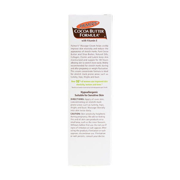 Palmer's Massage Cream for Stretch Marks is a luxurious cream specially formulated to help prevent and reduce the appearance of stretch marks. Enriched with a potent blend of ingredients, including cocoa butter, shea butter, and vitamin E, this cream deeply nourishes and moisturizes the skin, enhancing its elasticity and suppleness. The unique formula aids in promoting the skin's natural collagen and elastin production, which are crucial for maintaining the skin's resilience during periods of stretching. Regular use of Palmer's Massage Cream for Stretch Marks can leave your skin feeling incredibly soft, smooth, and more even-toned, while diminishing the visibility of stretch marks.