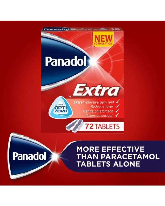 Panadol Extra Optizorb Tablets with the combination of paracetamol 500 mg and caffeine 65 mg, along with the advanced Optizorb technology fights tough pain including headache and period pain, it also provides back pain relief (and including lower back), tooth pain relief, neck pain relief and muscle pain relief. The combination of ingredients in Panadol Extra provides up to 37% more powerful relief than standard paracetamol, providing you with effective pain relief that allows you to stay on top of your day-to-day tasks. Each caplet contains 500 mg paracetamol and 65 mg of caffeine.