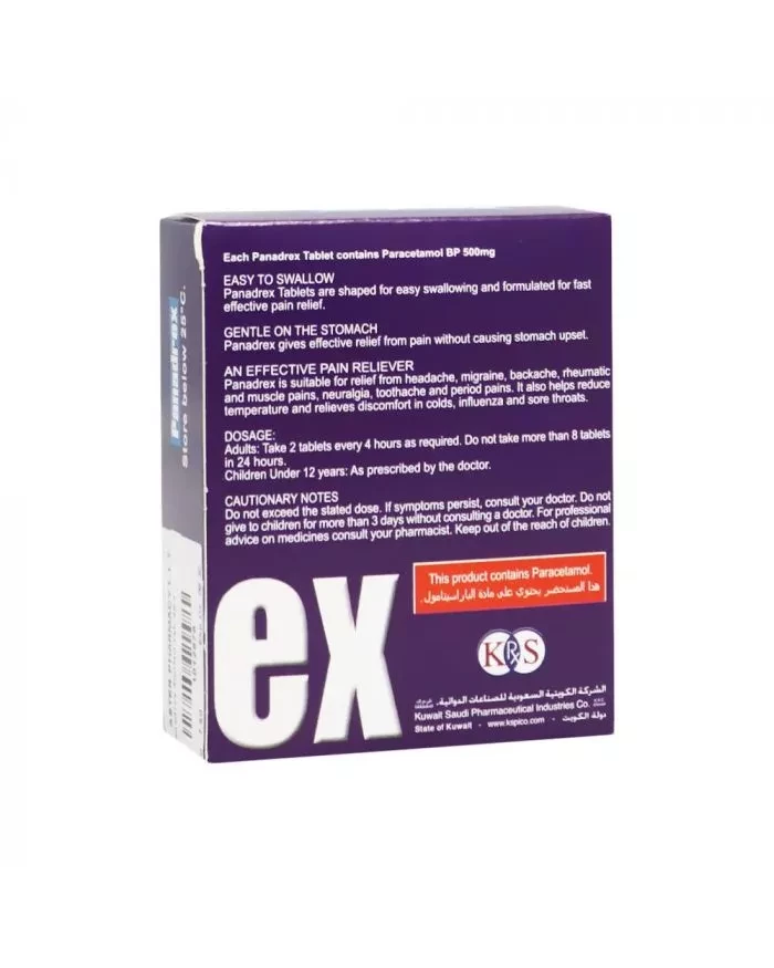 Panadrex Tablets is suitable for relief from headache, migraine, backache, rheumatic and muscle pains, neuralgia, toothache and period pains. It also helps reduce temperature and relieves discomfort in colds, influenza and sore throats.
