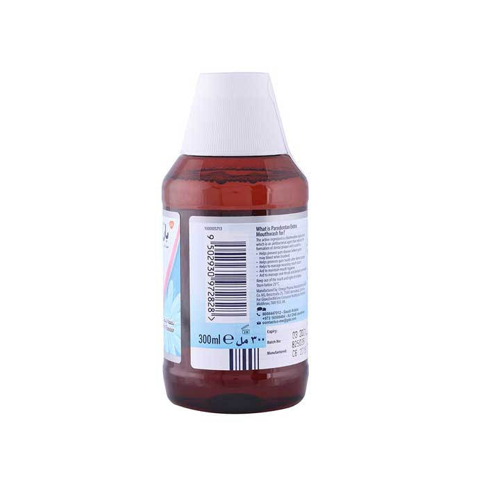 Parodontax Extra Mouthwash contains 0.2% chlorhexidine digluconate that helps to protect the gum from irritating gum, bleeding gum and mouth ulcers giving you a fresh and cool breath.Also suitable for gingival bleeding caused by dentures.It also helps keeping a good oral hygiene, removing dental plaque, dental cavities and gingival irritation.