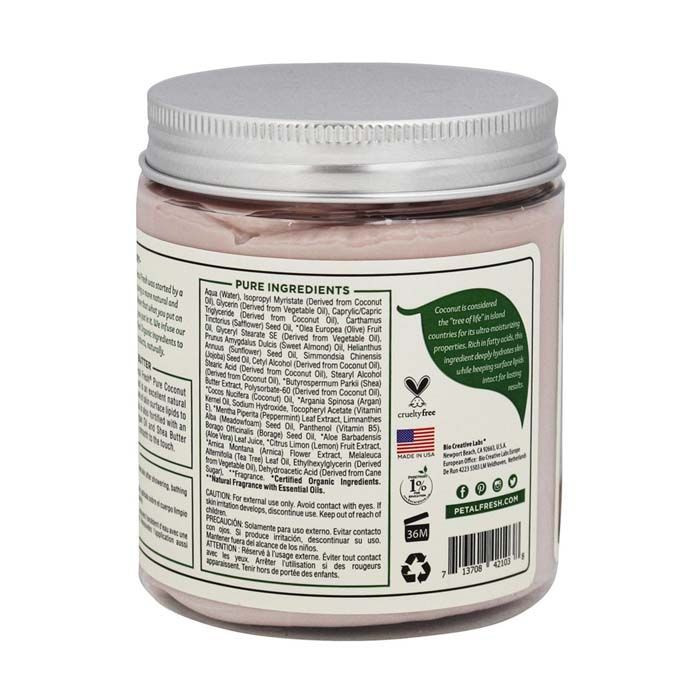 Petal Fresh Pure Coconut Body Butter is made from natural, ethically sourced ingredients. It is free from parabens, sulfates, and artificial fragrances, making it safe for sensitive skin. The formula is cruelty-free and dermatologically tested, ensuring the highest quality for all users.