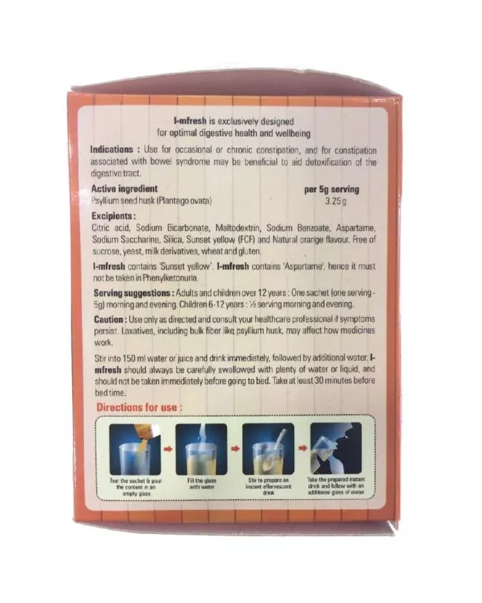 Imfresh is exclusively designed for optimal digestive health and wellbeing. Imfresh is available as a sugar free, effervescent, orange flavored micro fine powder in easy to carry and convenient to take single dose sachets. It is also used to relieve constipation, fecal incontinence, ulcerative colitis, hyperlipidemia, irritable bowel syndrome, diverticular disease, and diarrhea. They are also used as a regular dietary supplement to improve and maintain regular GI transit. The inert bulk of the husks helps provide a constant volume of solid material irrespective of other aspects of the diet or any disease condition of the gut.