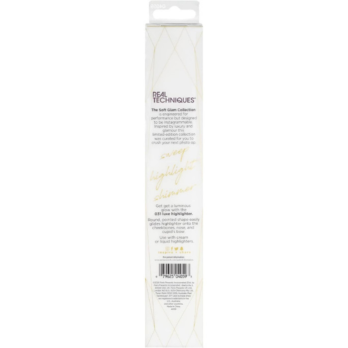 The Real Techniques Soft Glam Liquid Highlighter Brush features synthetic bristles that are cruelty-free and made from high-quality materials. These bristles are designed to be soft yet durable, ensuring optimal performance with every use. The handle is ergonomically designed for comfort and control during application, while the ferrule is made from durable metal, adding to the brush's overall quality.