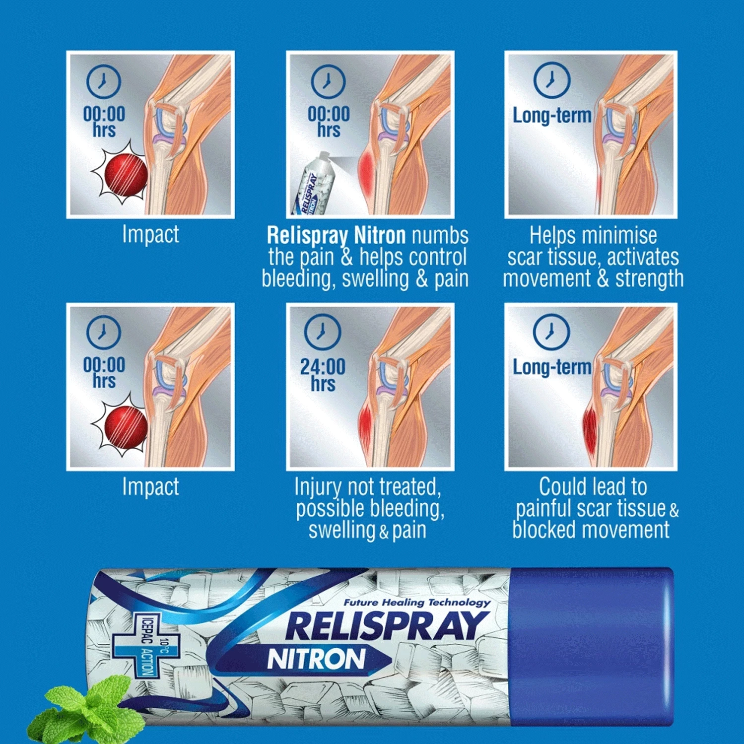 Relispray Nitron is the medically advised formula for impact injuries. Relispray Nitron combines the healing powers of Relispray with the future healing technology of the amazing ICEPAC action. It reduces swelling. Cools the wound up to 10 degree Celsius and begins the healing process, right away. The future healing technology of Relispray Nitron is approved by doctors and various sports coaches. It is a pain and swelling healing expert made with revolutionary aerosol technology that releases fast and penetrates the skin easily.