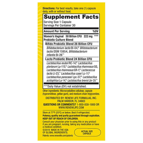 Renew Life Women's Care Probiotic Capsules are thoughtfully crafted by women, for women, with a powerful formula containing 50 billion live cultures. Designed to help maintain healthy vaginal bacteria and yeast levels, these capsules offer comprehensive support for immune, urinary, and digestive health. The delayed-release, once-daily capsule ensures the effectiveness of multiple clinically tested probiotic strains, contributing to a balanced and vibrant well-being.