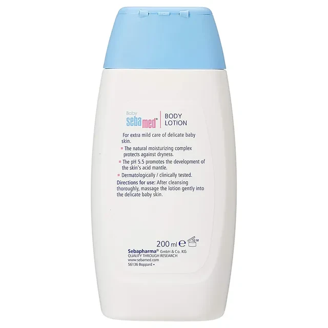 Sebamed Baby Lotion gives the baby's delicate skin gentle protection to safeguard it against dryness. Its moisturizing and emollient complex with 7% lipids is rapidly absorbed by the skin without greasy residue. Baby sebamed Baby Lotion has a mild and pleasant fragrance for baby's comfort. Free from colorants, nitro-mochus compounds, formaldehyde, nitrosamines, dioxane and phthalates.