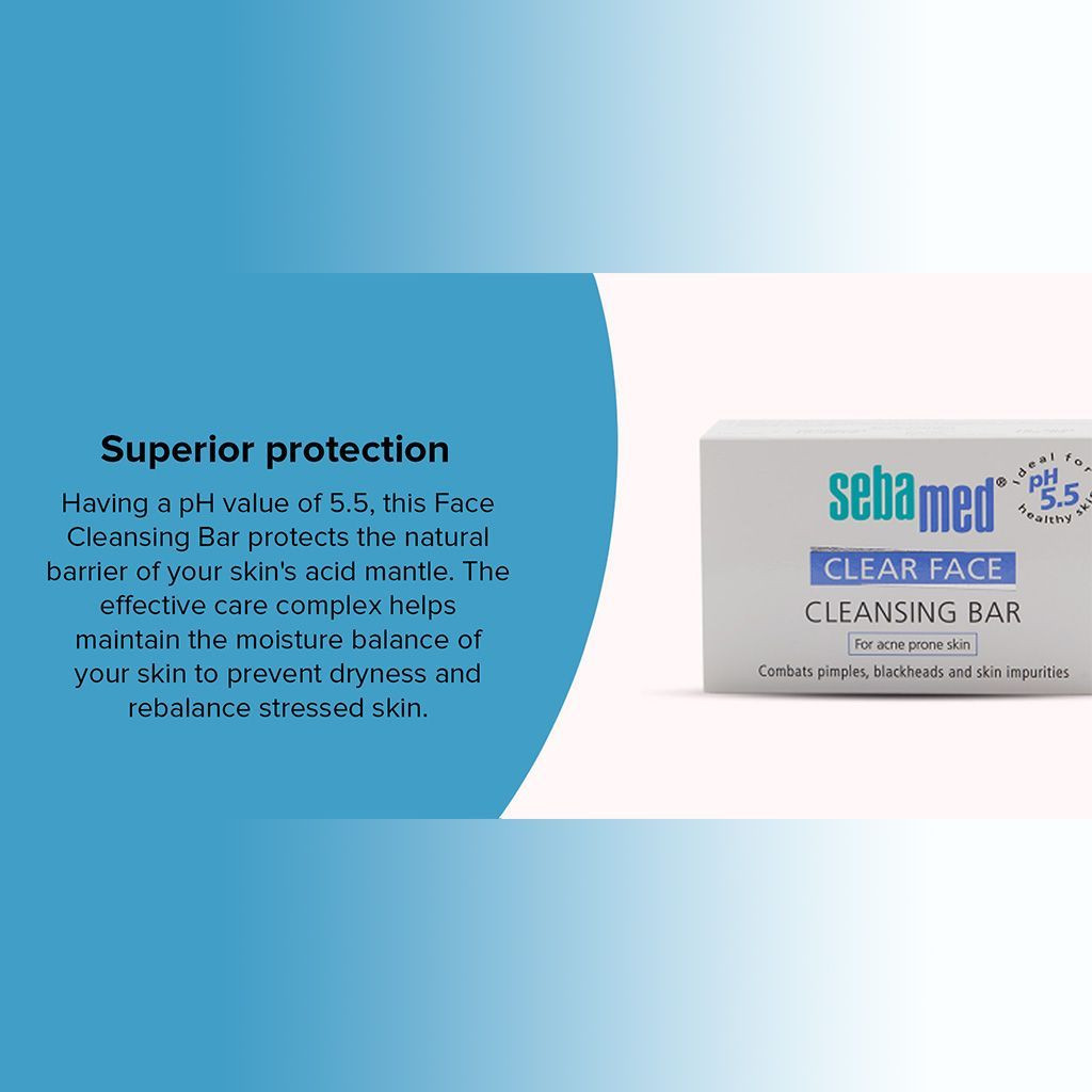 Sebamed Clear Face Cleansing Bar helps to fight pimples and is naturally effective against pimples, blackheads and skin impurities. Gently cleanses deep into the pores, without harsh soap or alkali. Cares for skin with valuable amino acids, important vitamins and active moisturizers. Compatible with the skin's own pH value of 5.5, it stabilizes the skin's natural protective acid mantle, which biologically protects against acne bacteria, thus helping to prevent new pimples from forming.