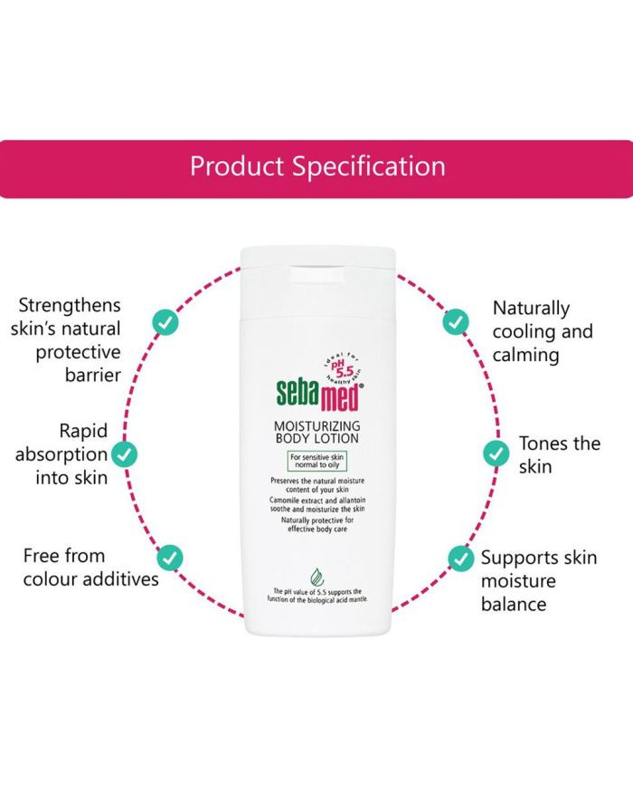 Sebamed Moisturizing Body Lotion nourishes and moisturizes damaged dry skin. Uniquely formulated to be gentle on sensitive skin, its pH 5.5 formulation helps support your skin's natural hydrolipid barrier (the acid mantle). It is recommended for normal as well as problematic skin conditions such as eczema and psoriasis.