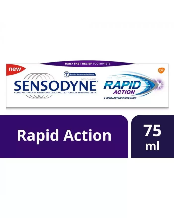 New Sensodyne Rapid Action provides clinically proven relief from sensitive teeth in just 60 seconds*. It relieves tooth pain when directly applying a pea-sized amount to a clean finger-tip and rub gently into each sensitive area (max twice per day) for 1 minute before brushing. That's because it is formulated to quickly create a barrier over sensitive areas of your teeth. When used twice daily, it provides long-lasting protection from sensitivity with twice daily brushing.