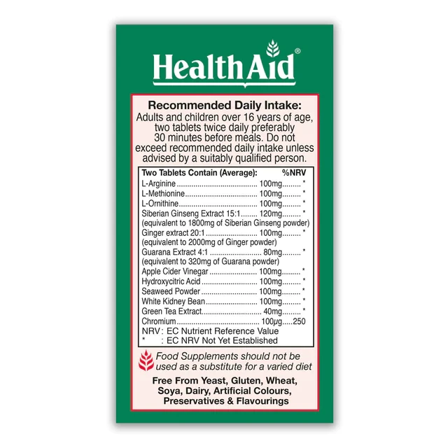 Maltodextrin, Microcrystalline Cellulose, Hydroxycitric Acid, L-Ornithine, L-Arginine, Siberian Ginseng Extract, L-Methionine, White Kidney Bean Extract, Seaweed Powder, Ginger Extract, Guarana Extract, Green Tea Extract, Apple Cider Vinegar Powder, Silicon Dioxide, Veg. Stearic Acid, Veg. Magnesium Stearate, Coating: [HydroxyPropyl Methyl Cellulose (HPMC), Glycerine], Chromium Picolinate.