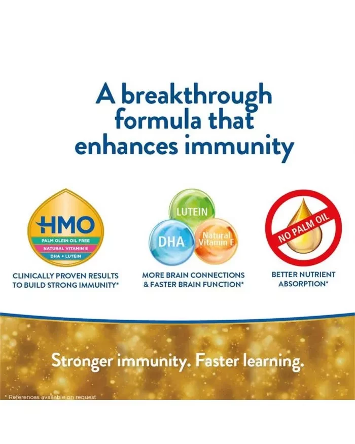 A breakthrough formula that enhances immunity. New and improved formula with HMO. Clinically proven results to strengthen immunity. Delivers more brain power from learning. Better absorption of key brain nutrients.