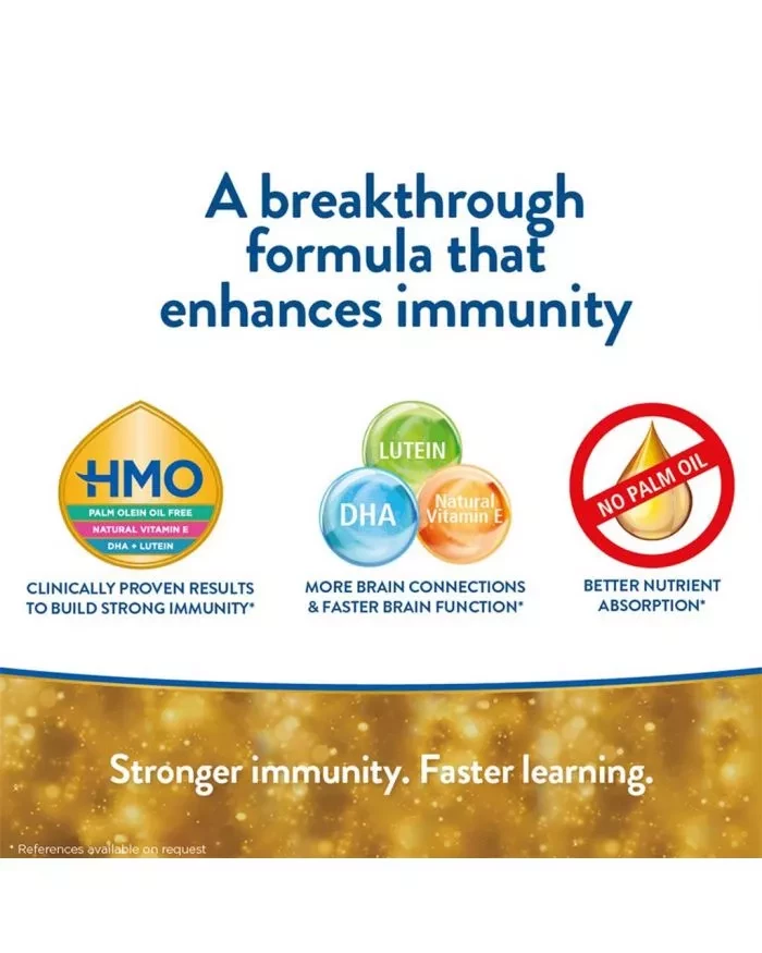 A breakthrough formula that enhances immunity. New and improved formula with HMO. Clinically proven results to strengthen immunity. Delivers more brain power from learning. Better absorption of key brain nutrients.