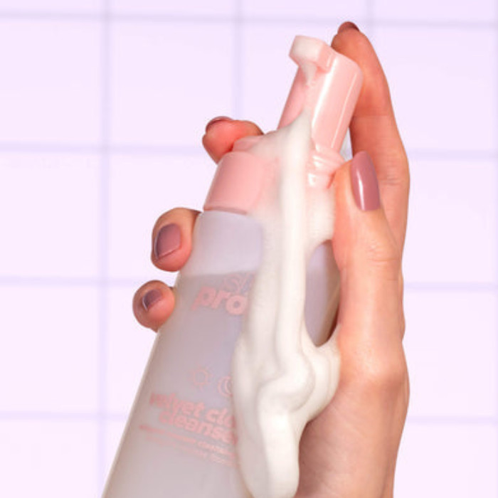 - Apply the Cleanser: Pump a small amount of the Velvet Cloud Cleanser onto your palms.