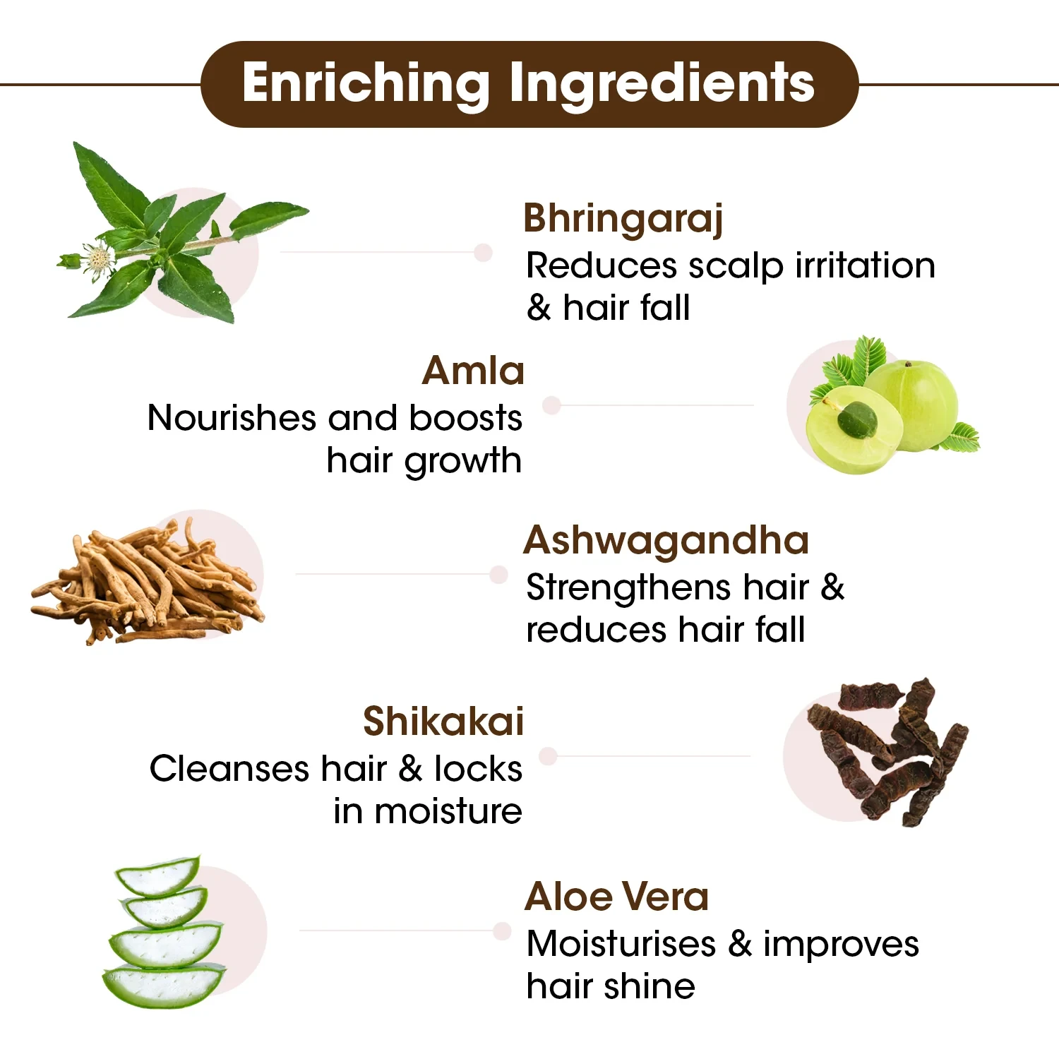 Natural Goodness Inside: The powerful combination of Bhringraj for hair rejuvenation, Amla and Ashwagandha for nourishment, Shikakai for deep cleansing and conditioning, Neem for dandruff-fighting, and Aloe Vera, Almond Oil, Guar Gum, and Shea Butter for a shiny and smooth finish.