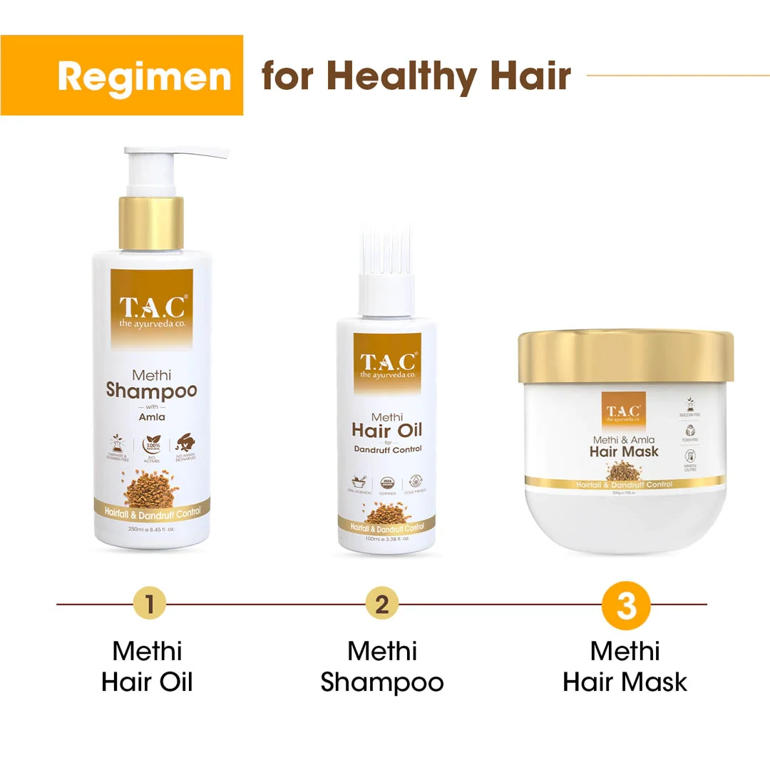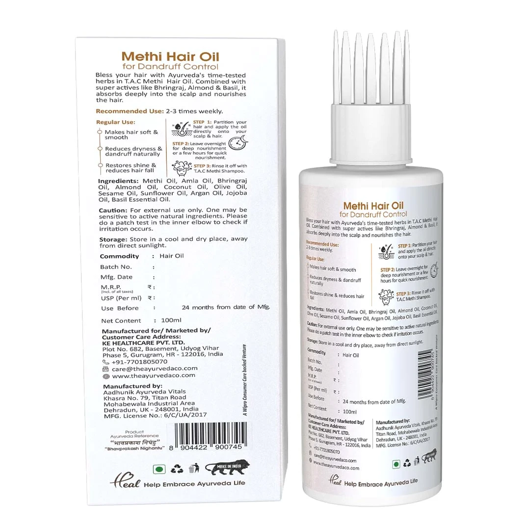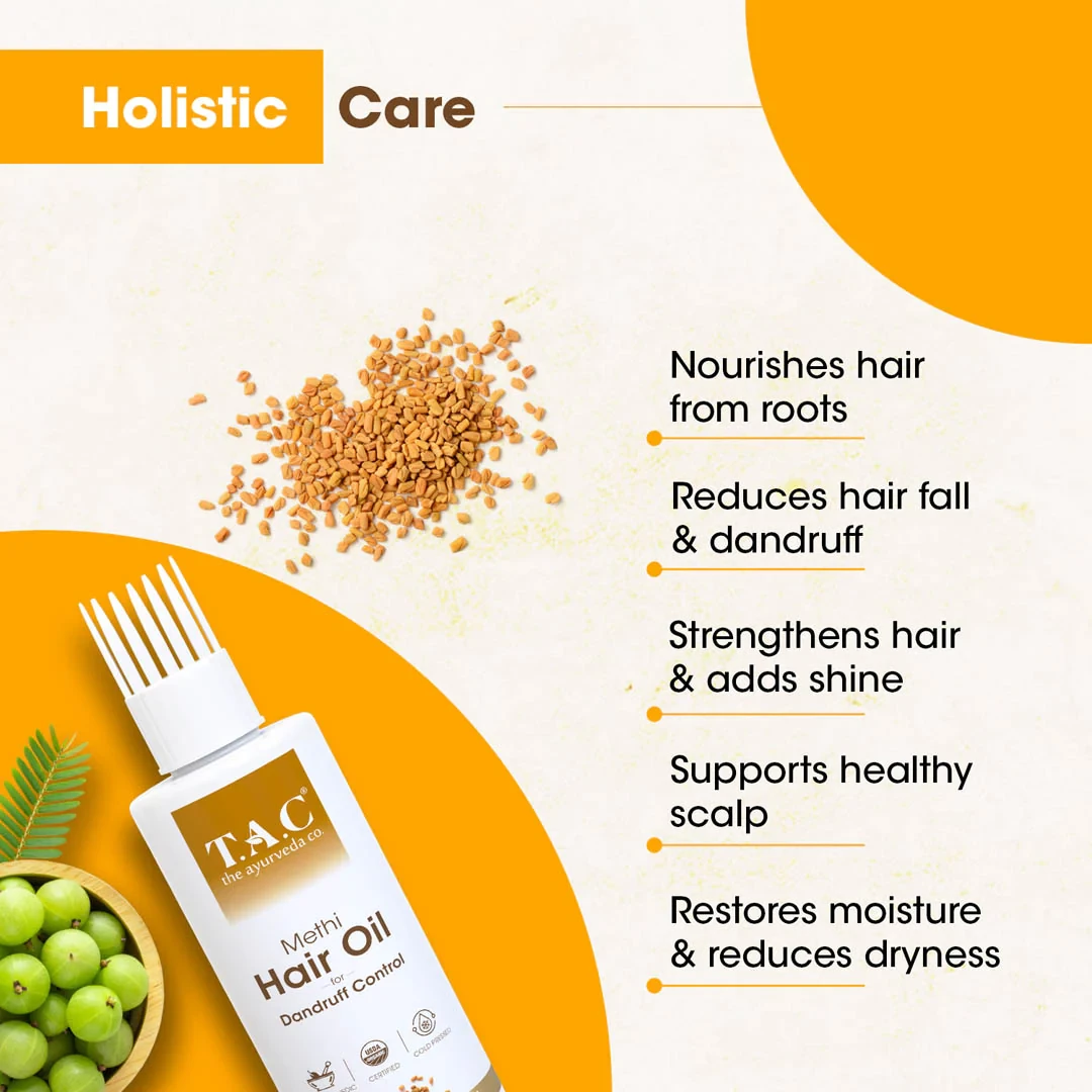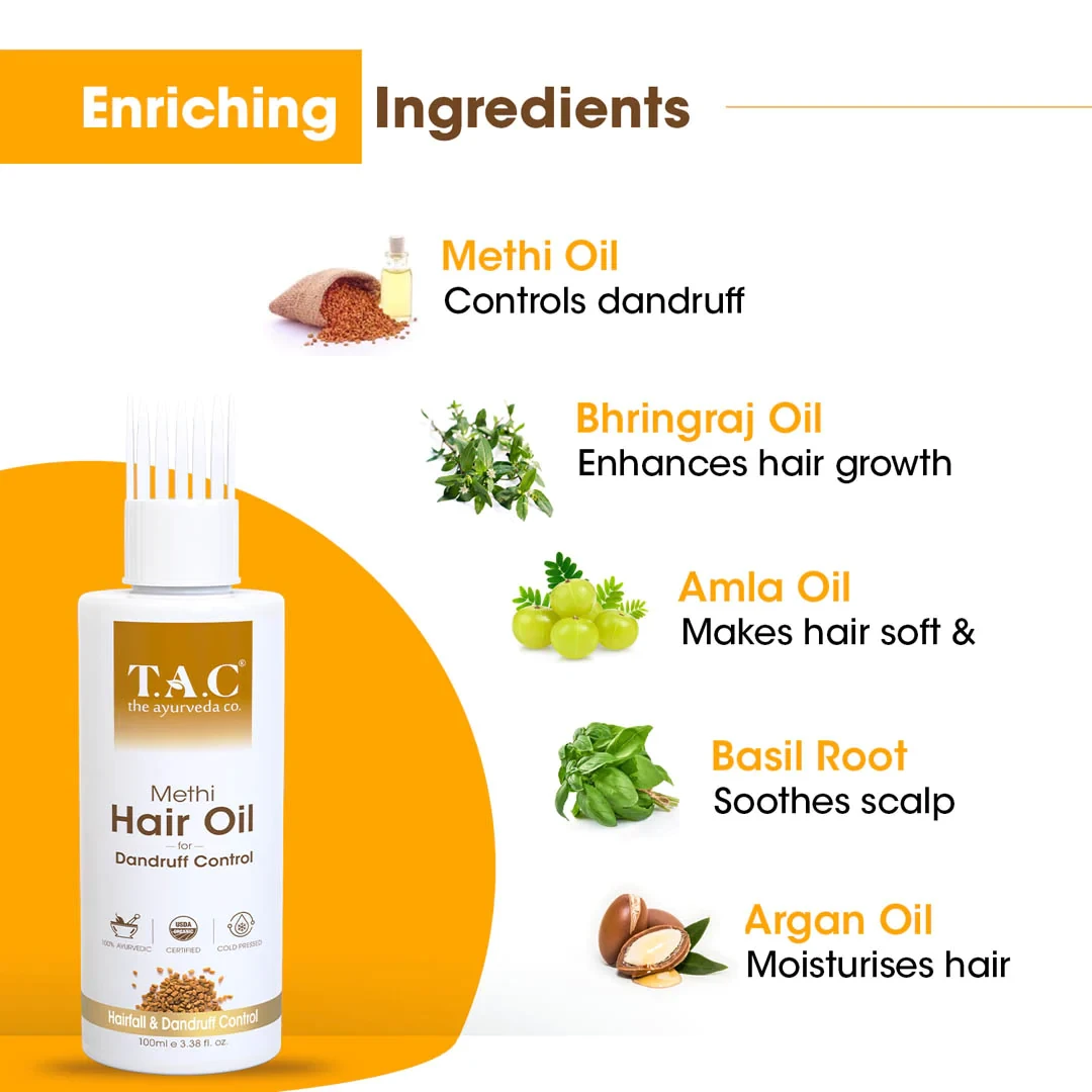 TAC Methi Anti-Dandruff Hair Oil is your natural elixir for achieving a healthy and youthful-looking mane. Crafted with the purest Methi, Amla, Bhringraj, Argan Oil, and Basil Root, this 100% organic hair growth oil provides holistic nourishment to both your scalp and hair. Immerse yourself in the purity of Ayurveda and witness the transformation to a lustrous, silky, and vibrant hair.