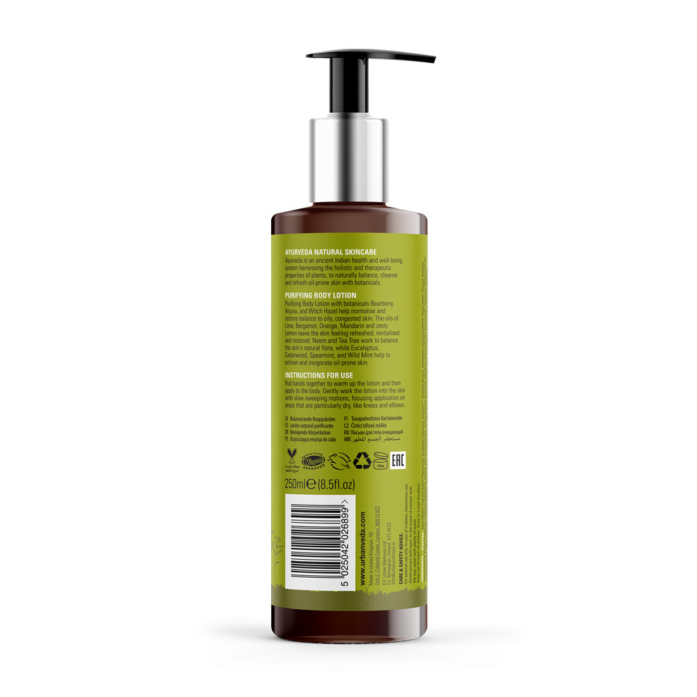 - Apply a generous amount of Urban Veda Neem Salicylic Acid Collagen Boosting Purifying Body Lotion to clean, dry skin.
