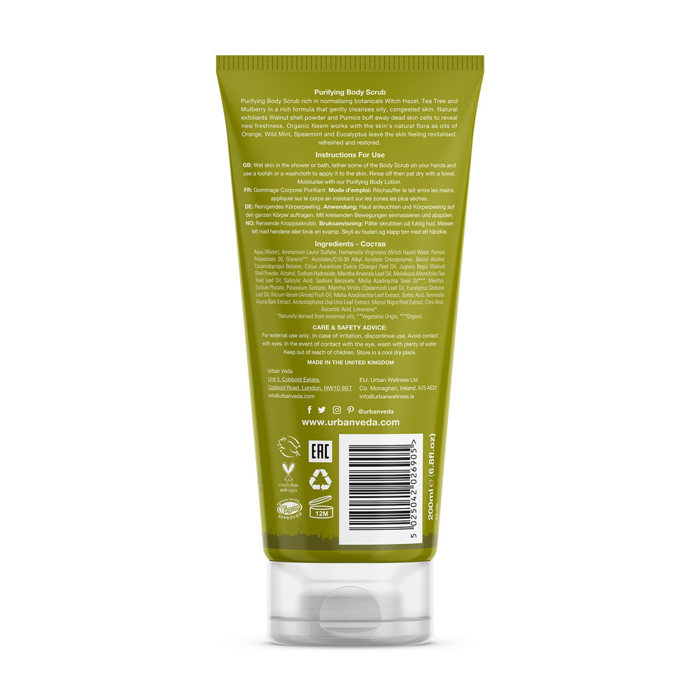 Urban Veda Purifying Neem & Salicylic Acid Body Scrub 200ml is a potent exfoliating treatment designed to purify and rejuvenate your skin. Infused with powerful ingredients like Neem and Salicylic Acid, this scrub deeply cleanses the skin, unclogs pores, and removes dead skin cells. Neem’s natural antibacterial properties help target body acne, while Salicylic Acid works to reduce inflammation and prevent future breakouts. The scrub's gentle exfoliating action refines skin texture, leaving your body feeling smooth, soft, and refreshed. Ideal for oily, acne-prone, or blemish-prone skin, this scrub promotes clear, glowing skin while helping to balance oil production and calm inflammation.