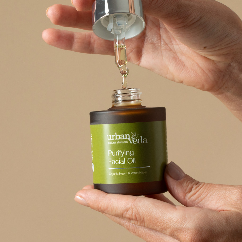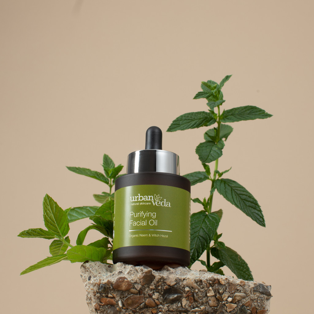 - Apply a few drops of Urban Veda Purifying Neem & Tea Tree Facial Oil to your face and neck.