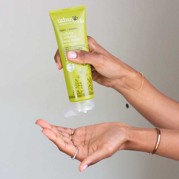 - Take a small amount of the Urban Veda Purifying Neem Tea Tree & Salicylic Acid Exfoliating Facial Polish and gently massage it onto your face in circular motions.