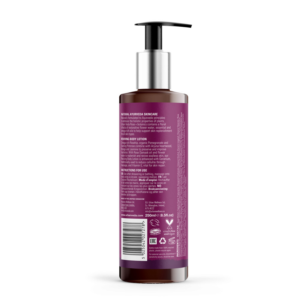Urban Veda Reviving Rose & Vitamin E Collagen Boosting Body Lotion 250ml is a luxurious body lotion formulated to nourish and rejuvenate your skin. This rich, non-greasy formula is infused with the goodness of rose extract and Vitamin E, working together to deeply hydrate, restore elasticity, and promote a youthful glow. Enriched with collagen-boosting properties, this body lotion helps improve skin texture, reduce signs of aging, and leave your skin feeling soft, smooth, and beautifully scented. Ideal for dry, dull, or aging skin, Urban Veda's Reviving Rose & Vitamin E Body Lotion provides long-lasting hydration while improving skin's firmness and elasticity.
