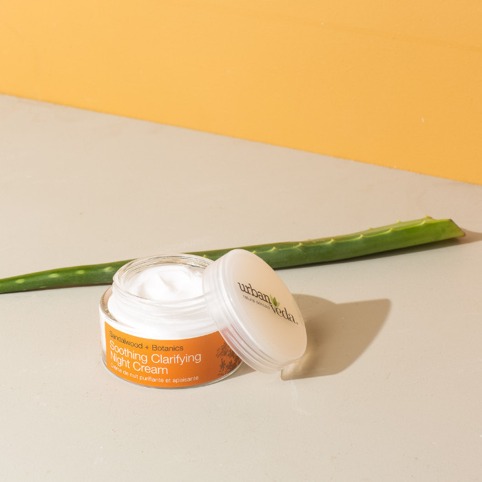 - Apply a small amount of Urban Veda Soothing Aloe Vera Clarifying Night Cream to your fingertips.
