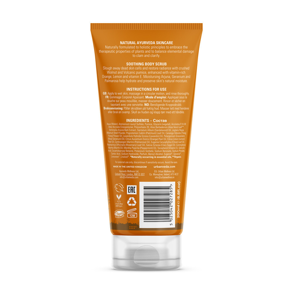 Urban Veda Soothing Sandalwood Aloe Vera Vitamin C Body Scrub 200ml is a luxurious, rejuvenating body scrub formulated to exfoliate, hydrate, and brighten the skin. This scrub blends the soothing properties of Sandalwood with the hydrating benefits of Aloe Vera and the skin-brightening power of Vitamin C. The gentle exfoliating action removes dead skin cells, revealing smoother, softer skin while also helping to reduce pigmentation and enhance skin clarity. Sandalwood calms irritated skin, while Aloe Vera deeply nourishes and soothes, making it ideal for sensitive or dry skin. This scrub is perfect for anyone looking to revitalize their skin, boost radiance, and maintain a healthy glow.