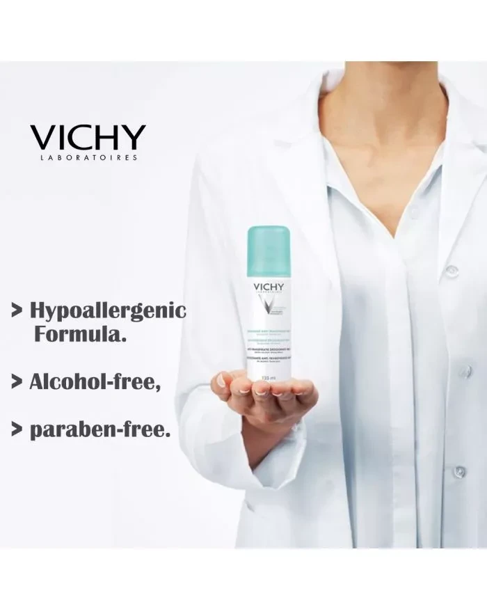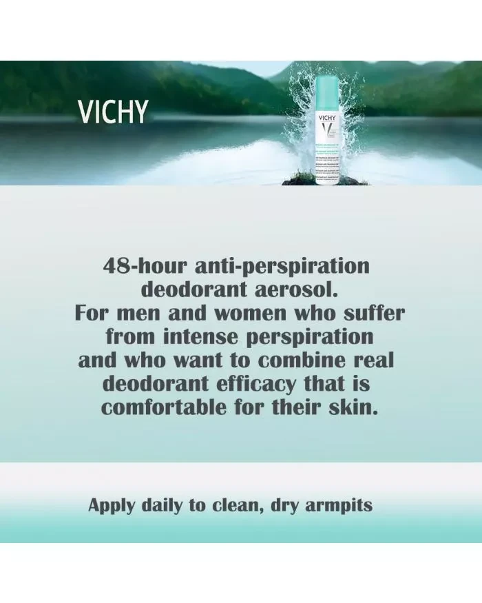 Vichy 48 Hour No Marks Anti-Perspirant Spray Deodorant has active ingredients that gives you an immediate intense freshness and security for up to 48 hours. Stay protected without the fear of white marks. Vichy 48 Hour No Marks Anti-Perspirant prevents the appearance of yellow marks on lighter clothing, white marks on dark clothing or leftover residue. This is an antiperspirant with high proven efficiency and protection. Vichy 48 Hour No Marks Anti-Perspirant Spray Deodorant keeps your underarms dry and odor-free for up to 48 hours while being kind to your skin. Vichy knows that underarm skin needs kindness as well as protection. That's why Vichy's antiperspirant deodorant gives you up to 48 hours of sweat and odor protection so you can stay cool and dry all day long. This non-irritating antiperspirant will leave your underarms feeling healthy and protected for up to 48 hours as it gives you long-lasting protection against underarm sweat and odor. Vichy Laboratories empower all women and men to maximize their skin and scalp health at every stage of life. Vichy believes that health is vital. And that it starts with the skin. Vichy's heart is connected to people, to their lives, to their skin. Vichy empowers all women and men, of all ages and phototypes to have a positive impact on their skin and scalp health, at every stage of their life. Discover Vichy's full range of products & treatments online. Care for Your Skin with clinically tested and dermatologically recommended Vichy Products.