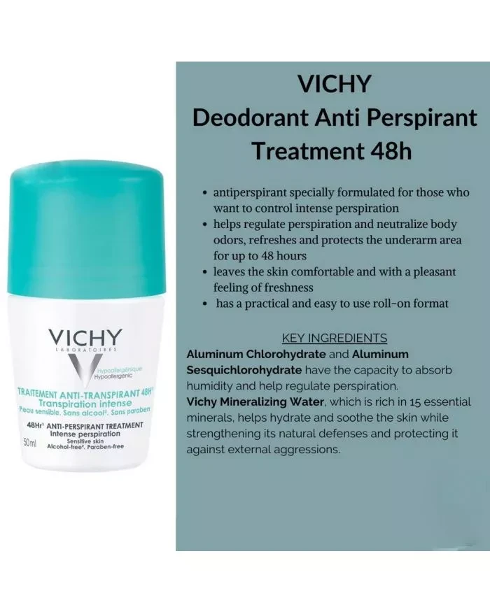 Vichy 48 Hours Anti Perspirant Deodorant Intensive Treatment is enriched with aluminum salts which has a long-term anti-perspiration efficacy causing no discomfort to skin. The micro-refined antiperspirant active ingredients mean increased targeting of sweat pores for protection for up to 48 hours. This long-lasting deodorant is enriched with Vichy's mineralizing thermal water, offering 15 minerals to protect and comfort the underarm skin. Vichy 48Hr Intense Anti-Perspirant Treatment Roll-On is for women and men who suffer from intense perspiration and who want to combine a long-term antiperspirant that is comfortable for their skin. Its extra strength formula deals with more intense underarm perspiration, and provides protection for up to 48 hours. Vichy Laboratories empower all women and men to maximize their skin and scalp health at every stage of life. Vichy believes that health is vital. And that it starts with the skin. Vichy's heart is connected to people, to their lives, to their skin. Vichy empowers all women and men, of all ages and phototypes to have a positive impact on their skin and scalp health, at every stage of their life. Discover Vichy's full range of products & treatments online. Care for Your Skin with clinically tested and dermatologically recommended Vichy Products.