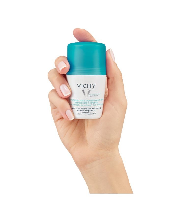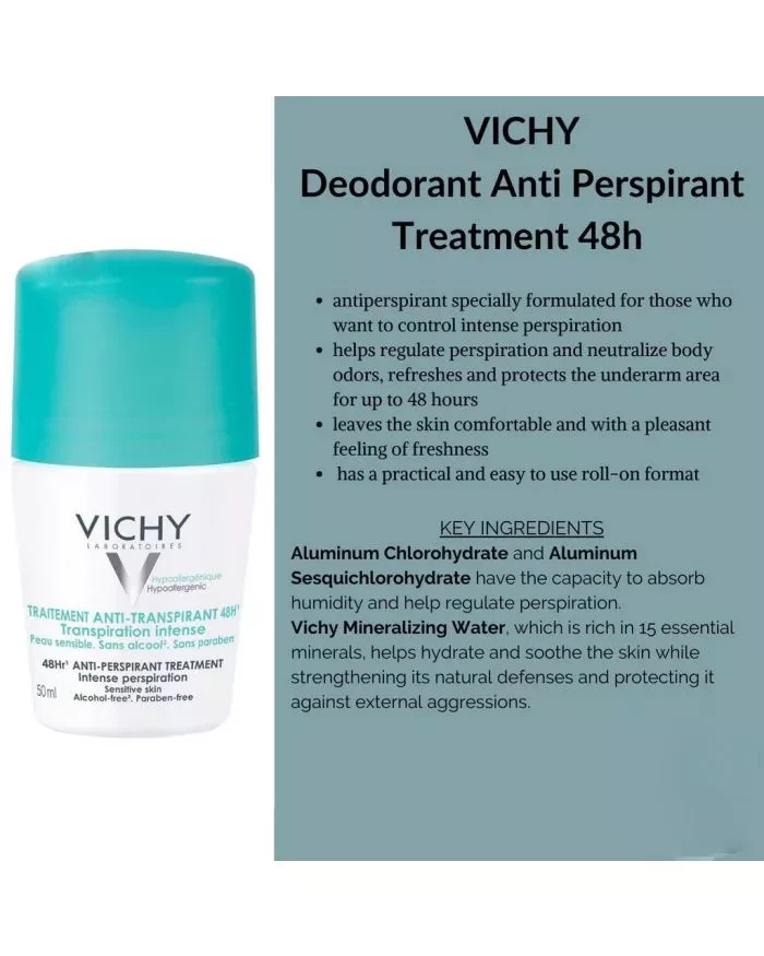 The? VICHY Deodorant 48Hour Intensive Anti-Perspirant Roll On?helps to control odors no matter the situation.? Blended with Vichy Mineralizing Water that's packed with 15 different minerals, your skin will be soothed and protected for comfort throughout the day. The formula dries quickly, making application quick and effortless. This antiperspirant formula gives you an immediate fresh sensation with up to 48-hour anti-perspiration efficacy. Its ‘no trace’ formula leaves no white marks or yellow stains and helps to prevent clothes from stiffening under the arm.