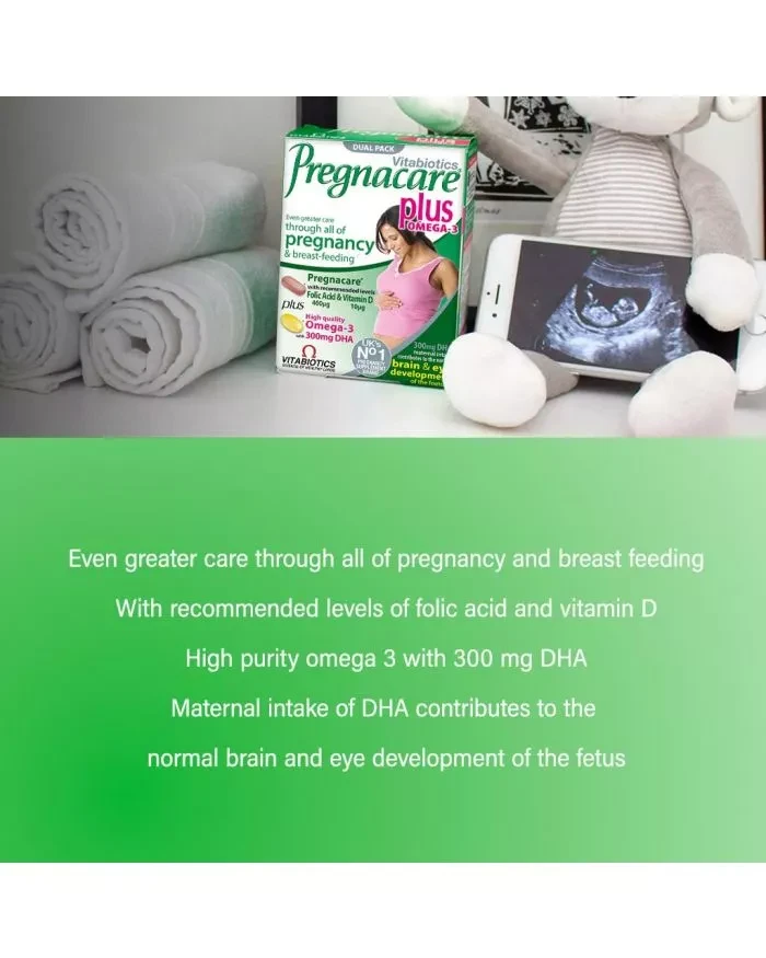 Vitabiotics Pregnacare Plus Omega-3 Pregnancy Multivitamin Dual Pack provides the original fully comprehensive multivitamin tablet, which delivers the essential nutrients for pregnancy including the recommended level of 400µg folic acid and 10 µg vitamin D as advised by the UK Department of Health during pregnancy and breast-feeding, plus an additional Omega-3 capsule to provide a rich source of docosahexaenoic acid (DHA) which contributes to normal brain and eye development of the foetus. Pregnacare Plus has been specially developed so that mothers-to-be can safeguard their extra dietary requirements, without confusion about which supplements to take. Low maternal folate status is a risk factor in the development of neural tube defects in the developing foetus. Pregnacare multi-nutrient slow disperse tablets with 400µg Folic Acid contains a careful formulation of 19 nutrients important for both mother and baby. These include vitamin B12, plus vitamin D and folic acid at the exact level recommended for the development of the unborn baby. Omega-3 capsules with 300mg DHA contain high purity fish oil, which are a rich source of the important Omega-3 fatty acids DHA and EPA. DHA is especially important during pregnancy as it contributes to normal brain and eye development of the foetus. During pregnancy, the growing foetus and placenta can increase certain maternal nutritional requirements. As it can be difficult to maintain this requirement through diet alone, taking Vitabiotics Pregnacare Plus will ensure you even greater nutritional care for mother and baby.