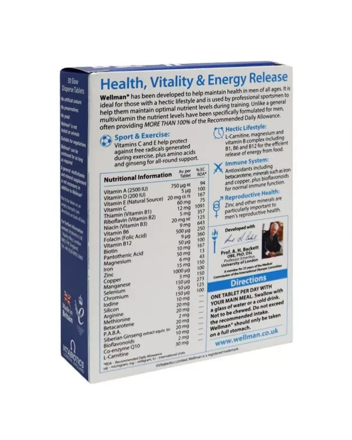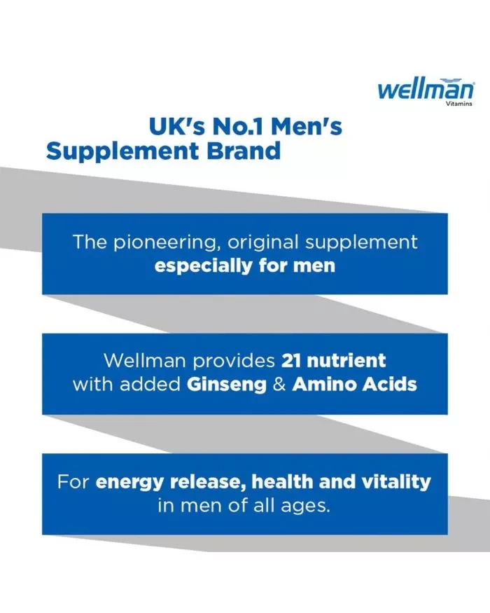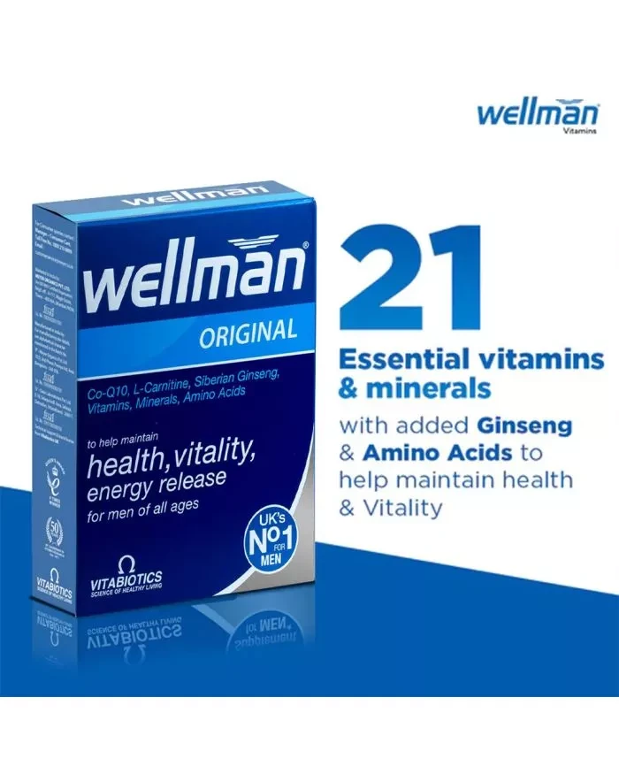 Vitabiotics Wellman Original Tablet is a multivitamin and mineral supplement specifically formulated for men. It is designed to support and maintain the overall health and well-being of men, taking into consideration their specific nutritional needs. It is ideal for those with a hectic lifestyle and is used by professional sportsmen to help them maintain optimal nutrient levels during training. Wellman is different from a regular multivitamin as its formula has been optimized for men's health based on international research evidence, while Wellman provides a core source of all the major vitamins and minerals plus Siberian ginseng, coenzyme Q10 and amino acids. Wellman Original provides a range of vitamins, including vitamins A, C, D, E, and the B-complex vitamins (B1, B2, B3, B6, B12, and folic acid). These vitamins play essential roles in supporting various bodily functions, such as immune function, energy production, and maintaining healthy skin, eyes, and bones. The supplement also includes important minerals such as zinc, magnesium, selenium, and iron. These minerals are involved in numerous physiological processes, including muscle function, hormone production, and antioxidant activity. Also, these minerals support a healthy reproductive system. It may also include amino acids such as L-arginine, which plays a role in cardiovascular health, and L-carnitine, which is involved in energy metabolism. Based on the latest scientific research, Wellman has been developed by a team of scientific experts. Wellman is currently used in training by several professional sportsmen. Wellman represents a simple solution, with an advanced one-a-day tablet, unlike a general multivitamin the nutrient levels have been specifically formulated for men, often providing more than 100% of the recommended daily allowance.