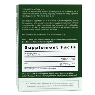 A: Vitamax Folic Acid provides the recommended daily dose of 400 mcg in a convenient tablet form, supporting both prenatal health and heart function with high-quality, non-GMO ingredients.