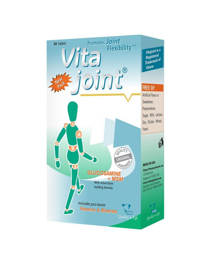 Vitane Vita Joint Tablets is a combination of high strength glucosamine and methylsulfonylmethane(MSM) with other bioactive bone building nutrients for maintaining healthy joints and muscles. It also provides unique combinations of trace minerals, vitamins and nutrients. Body's ability to manufacture glucosamine declines with age resulting in degradation of cartilage. Vita Joint provides glucosamine in the preferred potassium form. It is an important factor in the synthesis of collagen, which provides the natural cushion to cartilage. MSM is a naturally occurring organic compound. It helps reduce inflammation and pain in the affected joints. Copper contributes to the maintenance of normal connective tissues and therefore can be beneficial to cartilage (as cartilage is made up of connective tissues).Vitamin D, zinc and manganese also help to maintain normal bone. The formula doesn't contain any artificial flavors, preservatives & sweeteners.