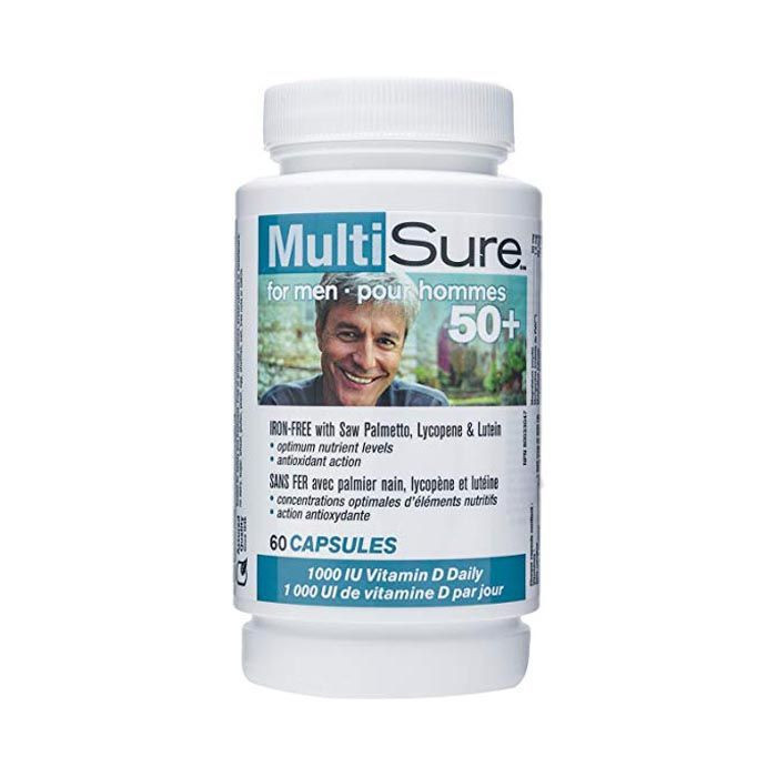 MultiSure Multivitamin with Minerals for men 50 and older, is an iron-free formula with added nutrients especially for men in that age group. Only 2 capsules daily provide good nutritional fundamentals at optimum value. This is a complete multiple vitamin and mineral formula to supplement the daily nutritional needs of men 50 and over who enjoy a lifestyle with lower stress levels and moderate activity. It is formulated with meaningful amounts of vitamins and minerals, such as natural source vitamin E, selenium, and zinc. The formula also features phytochemicals such as saw palmetto berry extract, for improved function of the prostate gland, alfalfa juice concentrate, a nutrient-rich plant, and lutein, a yellow-orange carotene that helps preserve and enhance eye function.