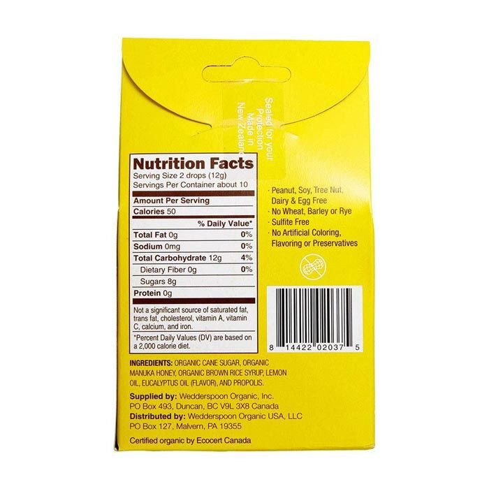 Wedderspoon Organic Manuka Honey Drops Lemon 120g (20's) offer a delicious and natural way to soothe sore throats, reduce coughing, and support your immune system. With the combined power of UMF™ Manuka honey and refreshing lemon, these lozenges provide a potent antibacterial and immune-boosting solution. Made with 100% organic ingredients, Wedderspoon Honey Drops are the perfect natural remedy for throat discomfort, digestive support, and overall wellness. Add them to your daily routine for a healthy, refreshing, and soothing experience.
