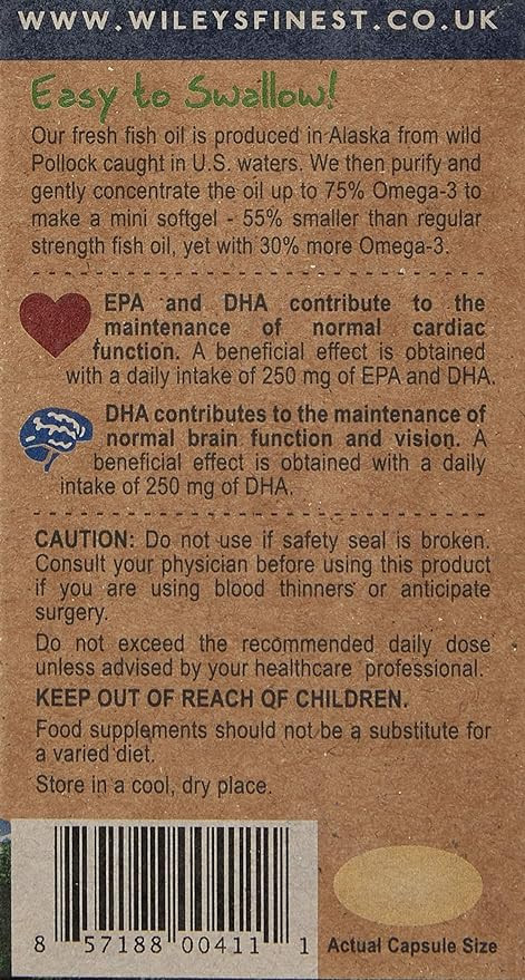 Wiley's Finest Easy Swallow Minis 630mg EPA + DHA Omega-3 Fish Oil offers a potent blend of essential fatty acids sourced from wild Alaskan fish. Each small, easy-to-swallow capsule contains 630mg of EPA and DHA, supporting heart, brain, and overall health. Made with sustainable practices, this supplement is ideal for those seeking high-quality Omega-3 nutrition in a convenient form