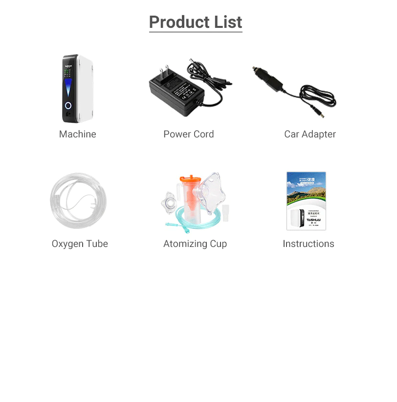 Oxygen Machine *1 Power Adapter *1 Atomizing Cup *1 Oxygen Tube *1 User Manual *1 Car Adapter *1
